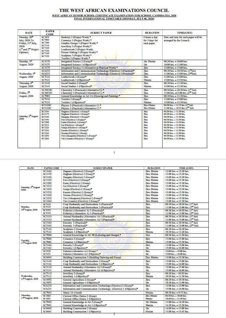 View The Final Wassce 2020 Timetable In A Text Format Released By Waec Opera News